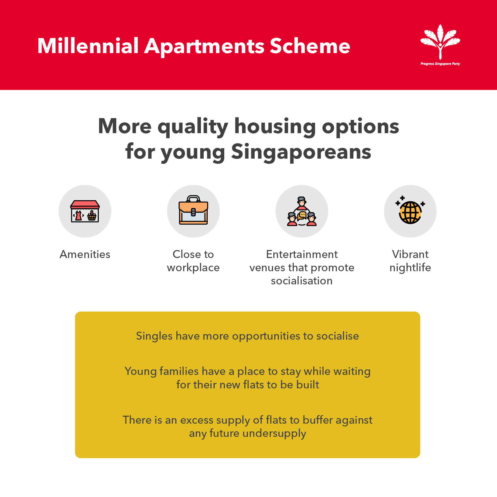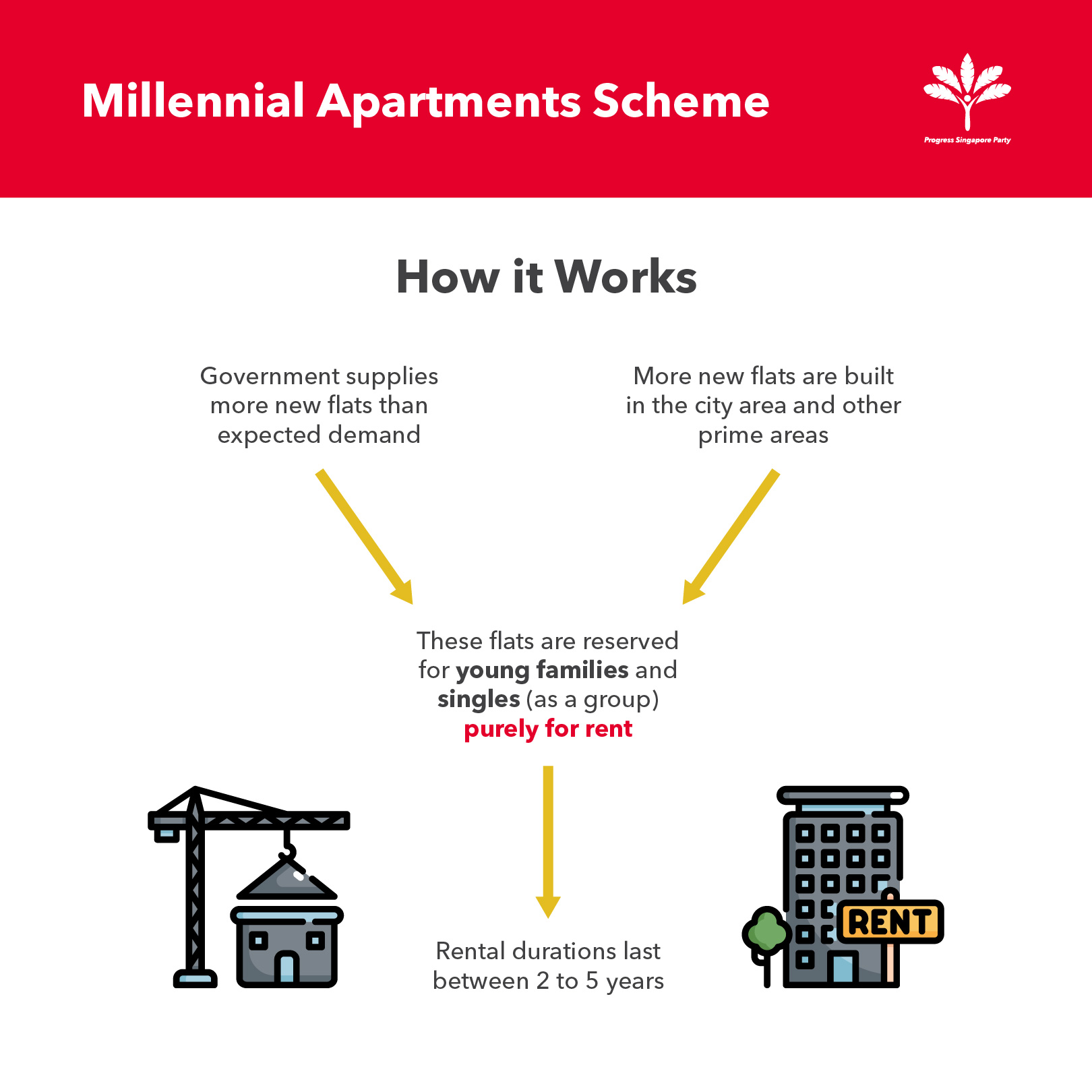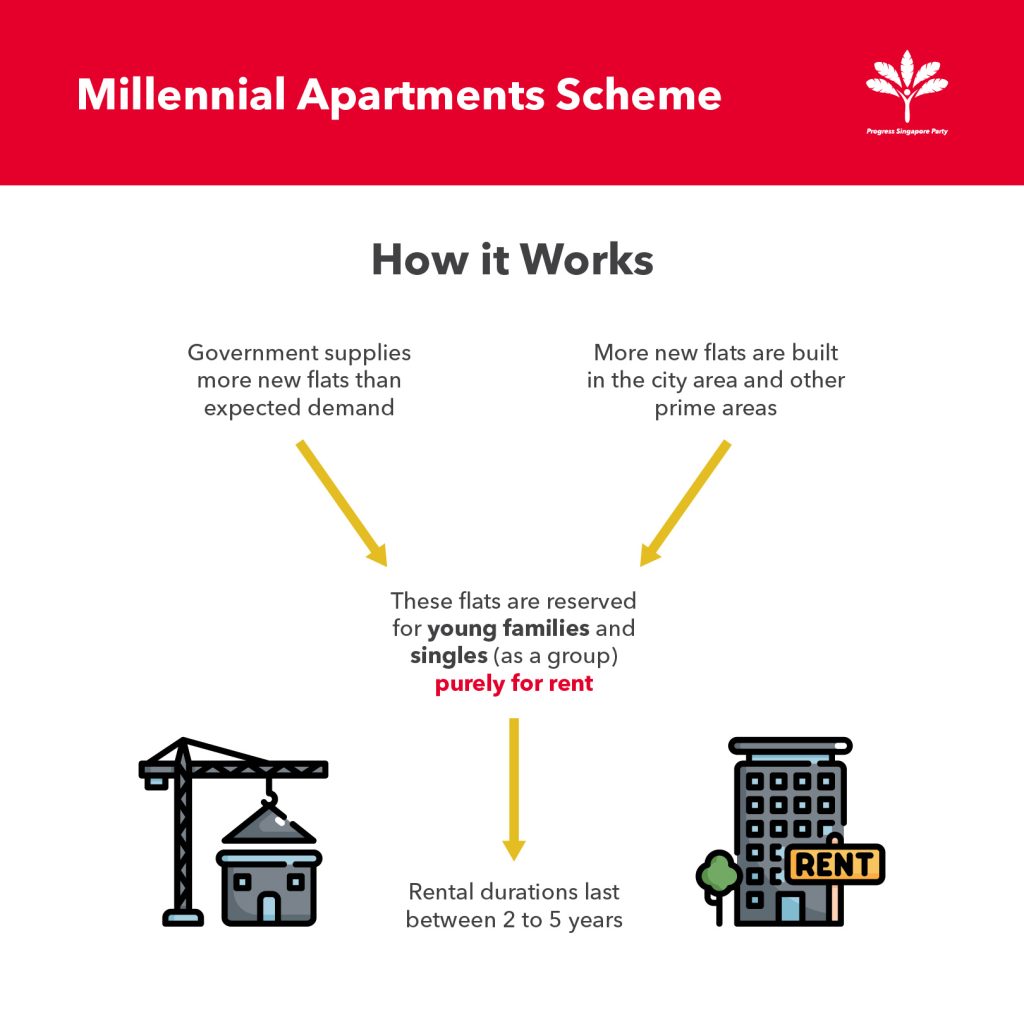 (2) The Millennial Apartments Scheme, which will make quality flats available for young couples and groups of singles for long-term rental (2 to 5 years) at affordable rates. This will provide young Singaporeans with more options for affordable housing.
