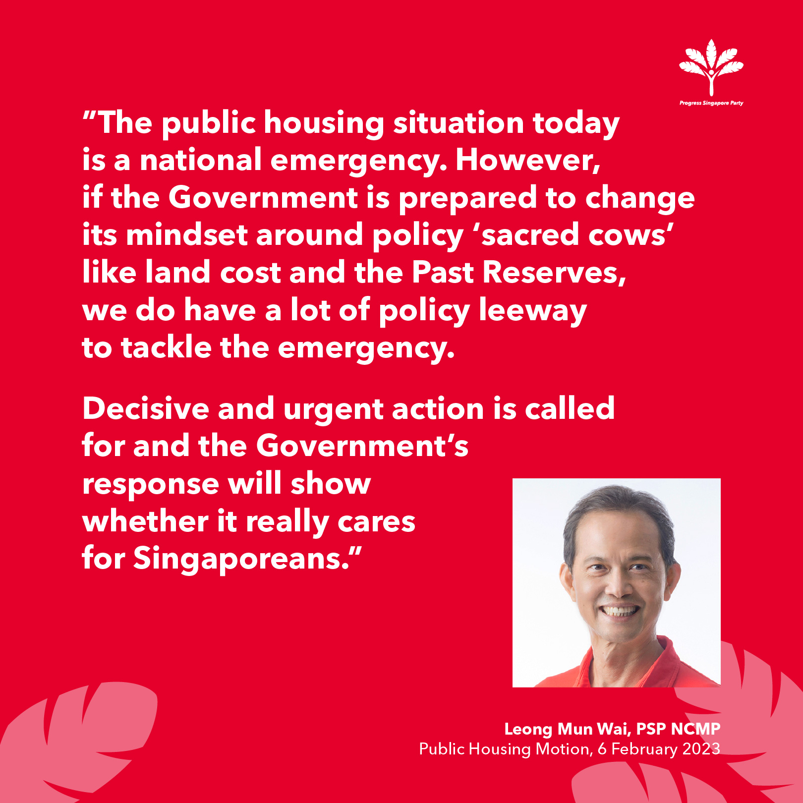 In my speech to open the debate today, I discussed the many problems that are now associated with public housing, such as the unaffordability of resale flats, depletion of our CPF savings to pay for mortgages, lease decay, and the negative impacts of long waiting times for BTO flats on family formation.
