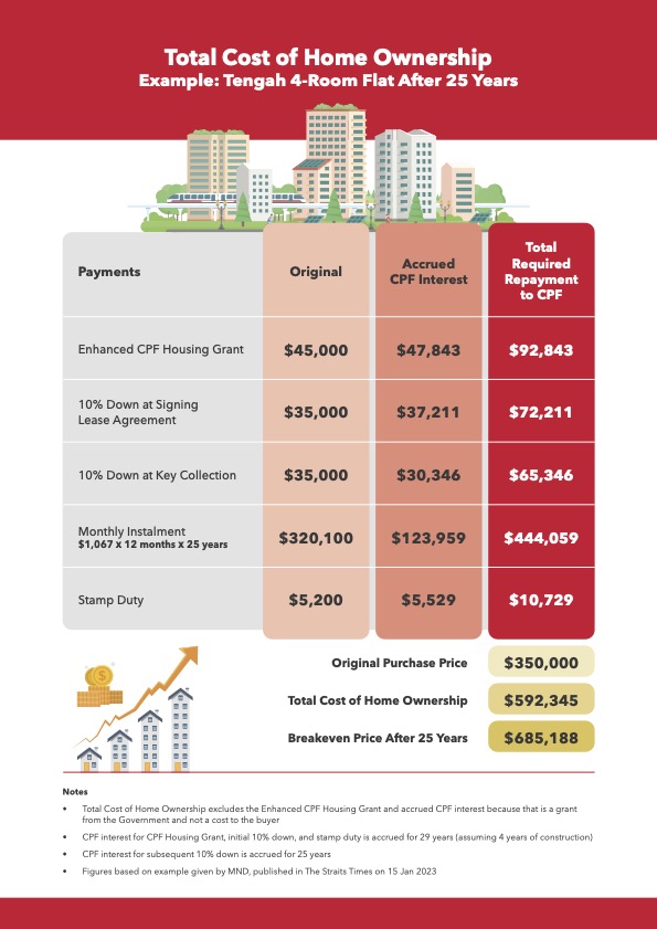 A new 4-room BTO flat at Tengah that initially costs $350,000 will actually cost the buyer $592,000 in CPF savings after 25 years of principal repayment and financing costs. This is the total cost of home ownership to the buyer, and it is 70% higher than the purchase price. The drain on CPF savings will be even larger for those who purchase resale flats, and also for future generations as BTO prices continue to follow the rise in resale prices.